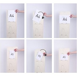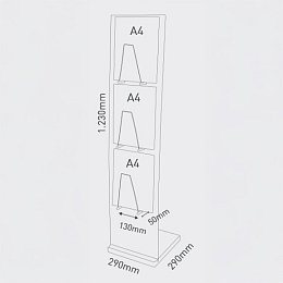 Freestanding brochure stand with 3 compartments for A4 and A5 in portrait and landscape format, made of wood and stainless steel.